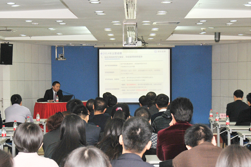 張總裁在會議上做了2014年年度工作報告及2015年工作安排,全面客觀地回顧了一年來公司各項工作進展情況,發(fā)現(xiàn)問題,總結(jié)得失,并根據(jù)戰(zhàn)略規(guī)劃部署了新一年重點工作任務。2014年是公司進行戰(zhàn)略轉(zhuǎn)型的第一年,在“抓住機遇、提質(zhì)增效”的指導思想下,圍繞抓好融資結(jié)構(gòu)升級和風控手段創(chuàng)新兩個著力點,加快干部隊伍建設梯隊化和年輕化步伐,構(gòu)建了“業(yè)務行業(yè)化、融資多元化、風控專業(yè)化”的經(jīng)營新格局。