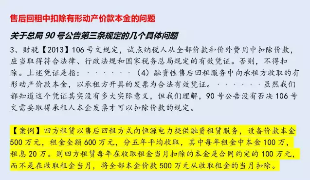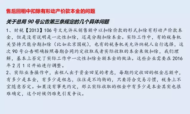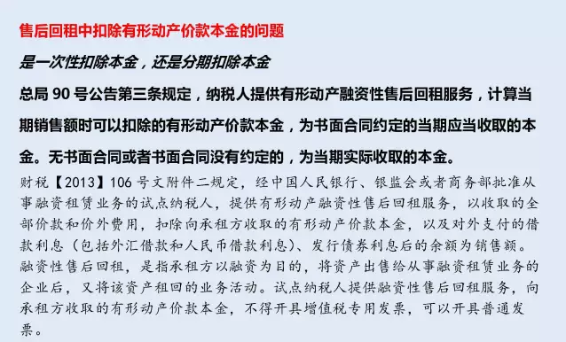 90號公告第三條規(guī)定,納稅人提供有形動產(chǎn)融資性售后回租服務(wù),計算當期銷售額時可以扣除的有形動產(chǎn)價款本金,為書面合同約定的當期應(yīng)當收取的本金。無書面合同或者書面合同沒有約定的,為當期實際收取的本金。