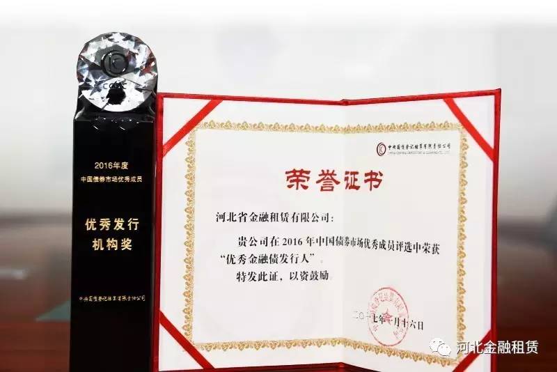 2016年,河北省金融租賃有限公司發行首單金融債5億元,憑借良好的經營管理水平和信用評級表現,受到了投資者及主管部門的充分認可,確立了專業、誠信的市場形象,贏得了良好的市場聲譽。這一榮譽的獲得充分反映了銀行間債券市場成員對河北金租的廣泛認可,進一步鞏固了河北金租在資本市場的良好信用形象,提升了公司市場知名度、影響力,也為公司后續從資本市場融資創造了良好的市場環境和條件。
