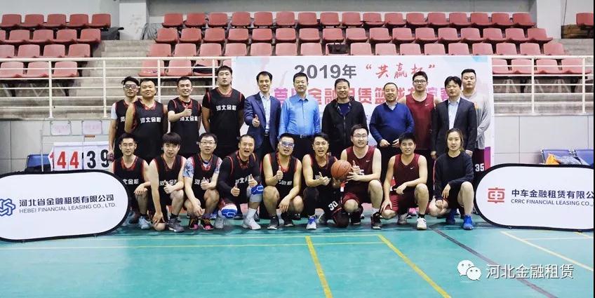 ▲河北金租董事長徐敏?。ê笈庞椅澹?、監事長肖剛(后排右六)、副總裁李永德(后排右七)、工會主席石拴江(后排右四)等與籃球隊合影。
