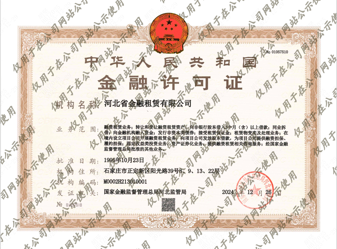 根據(jù)《國家金融監(jiān)督管理總局辦公室關于加強銀行保險機構許可證管理的通知》(金辦便函〔2023〕515號)文件要求,河北省金融租賃有限公司于2024年12月26日換領新《中華人民共和國金融許可證》,現(xiàn)予以公示。